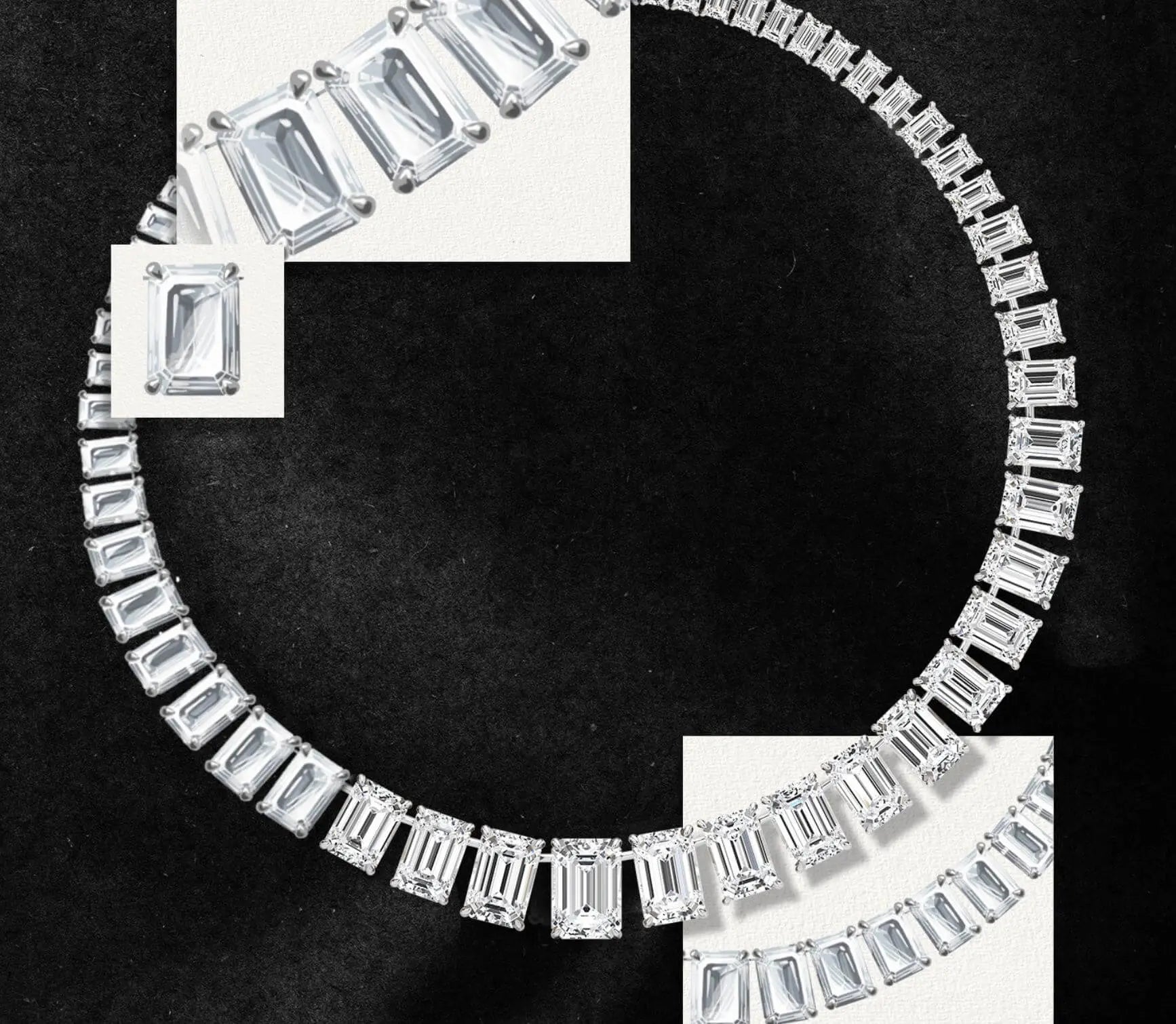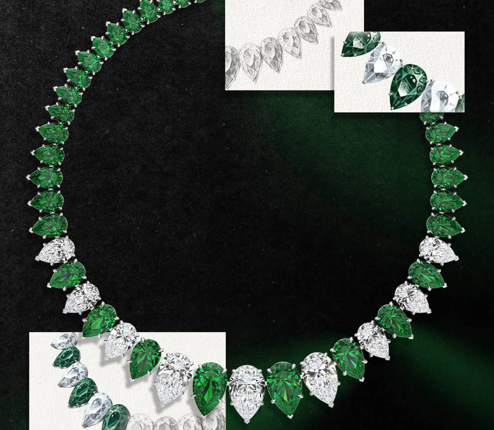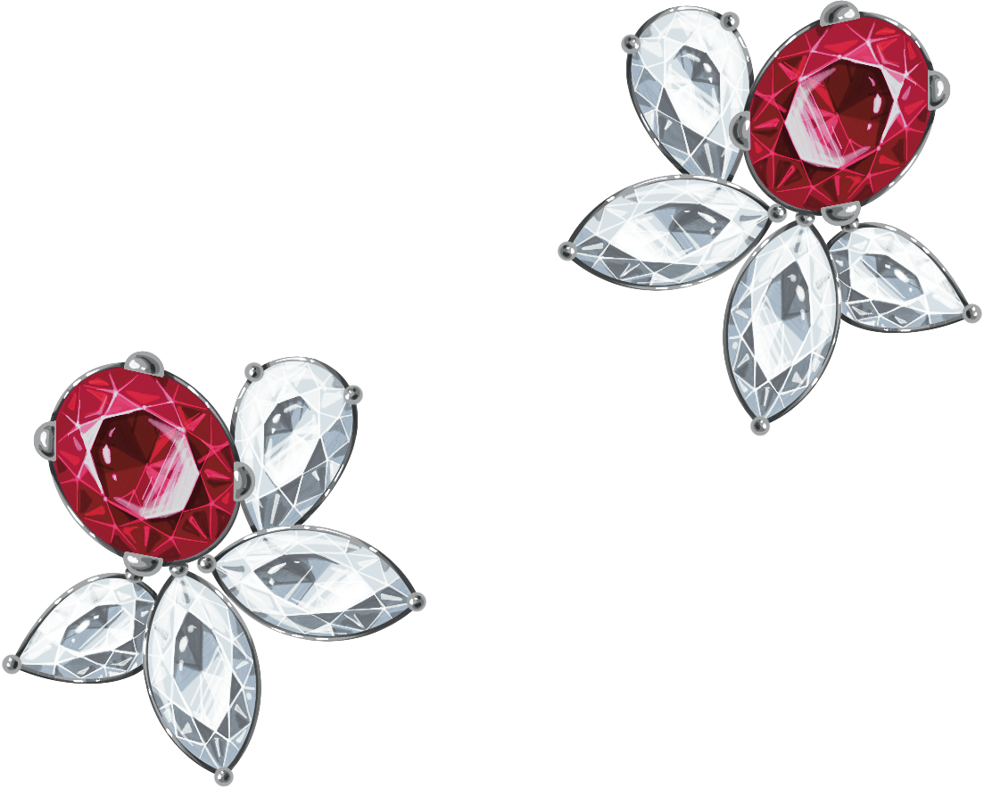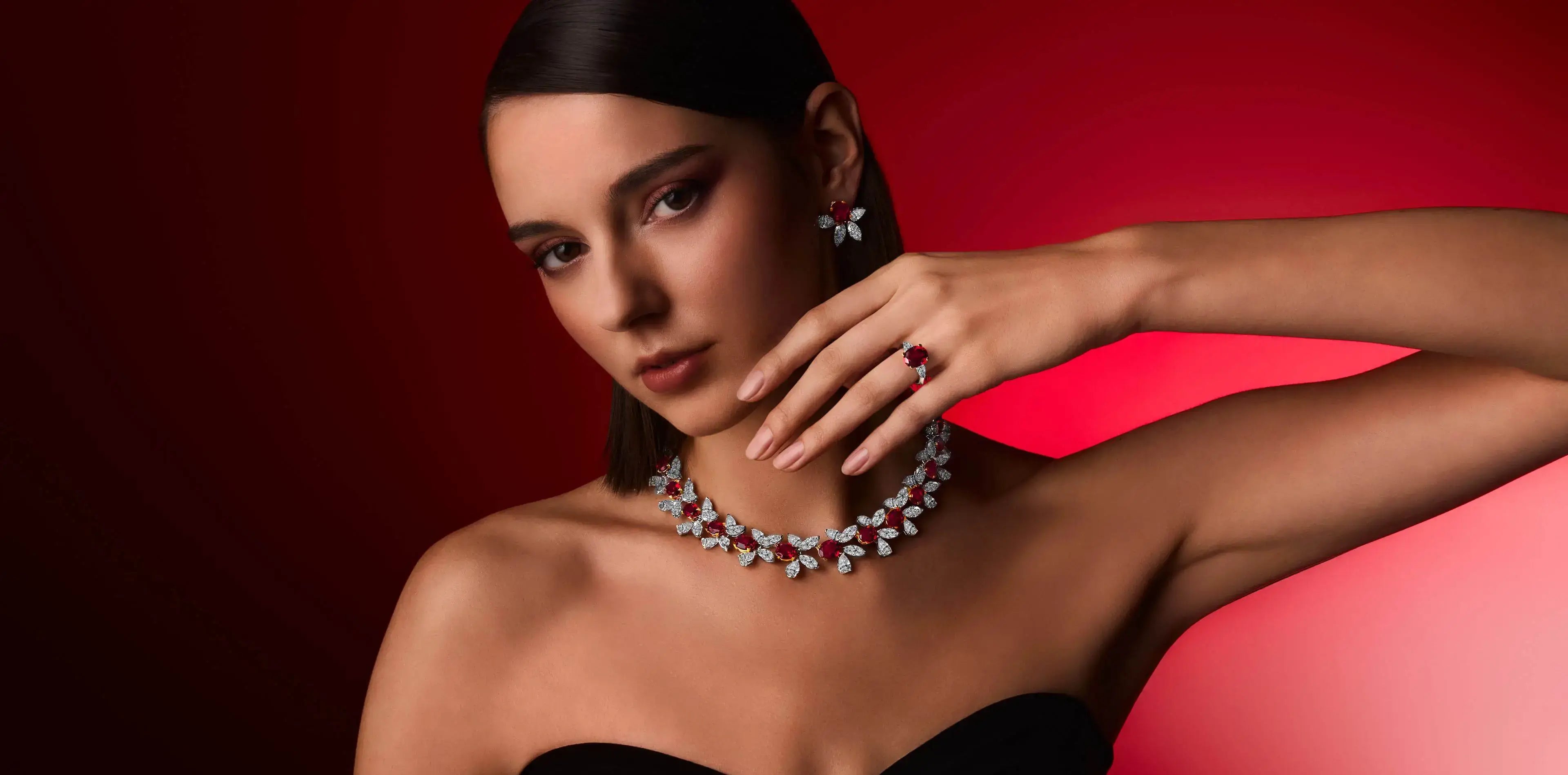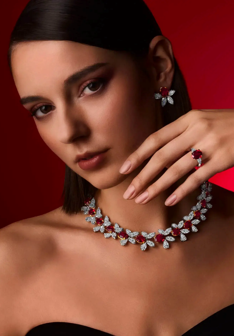 This ensemble harmonises vibrant oval-cut rubies—ranging from 1.64 to 5.15 carats—paired with marquise and pear-shaped white diamonds, all hand-set in 18K gold. The necklace features 50 masterfully cut stones, meticulously placed to create balance and brilliance. A floral-inspired pair of earrings and a bold split-band ring complete the composition, celebrating craftsmanship as artistry in motion.